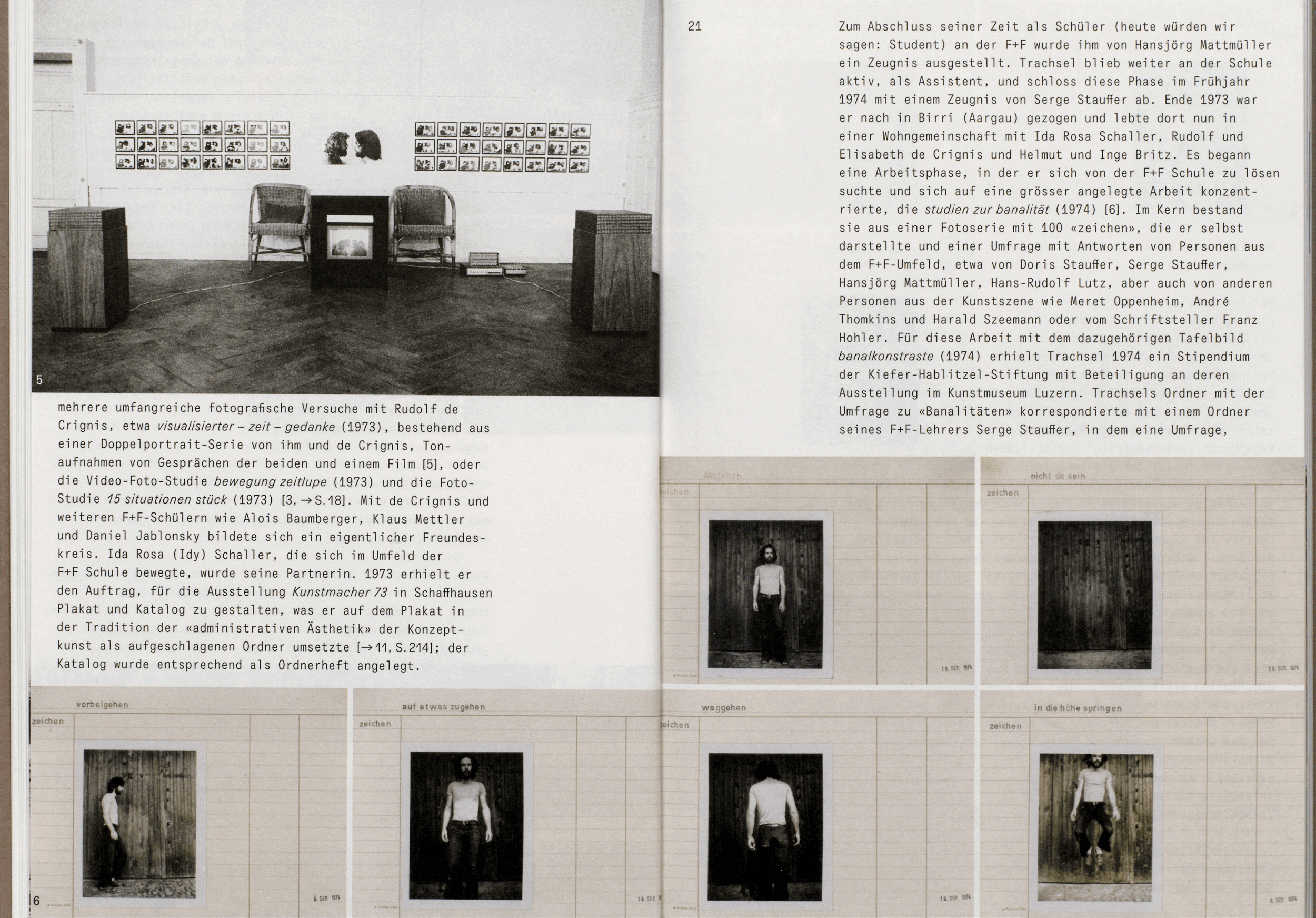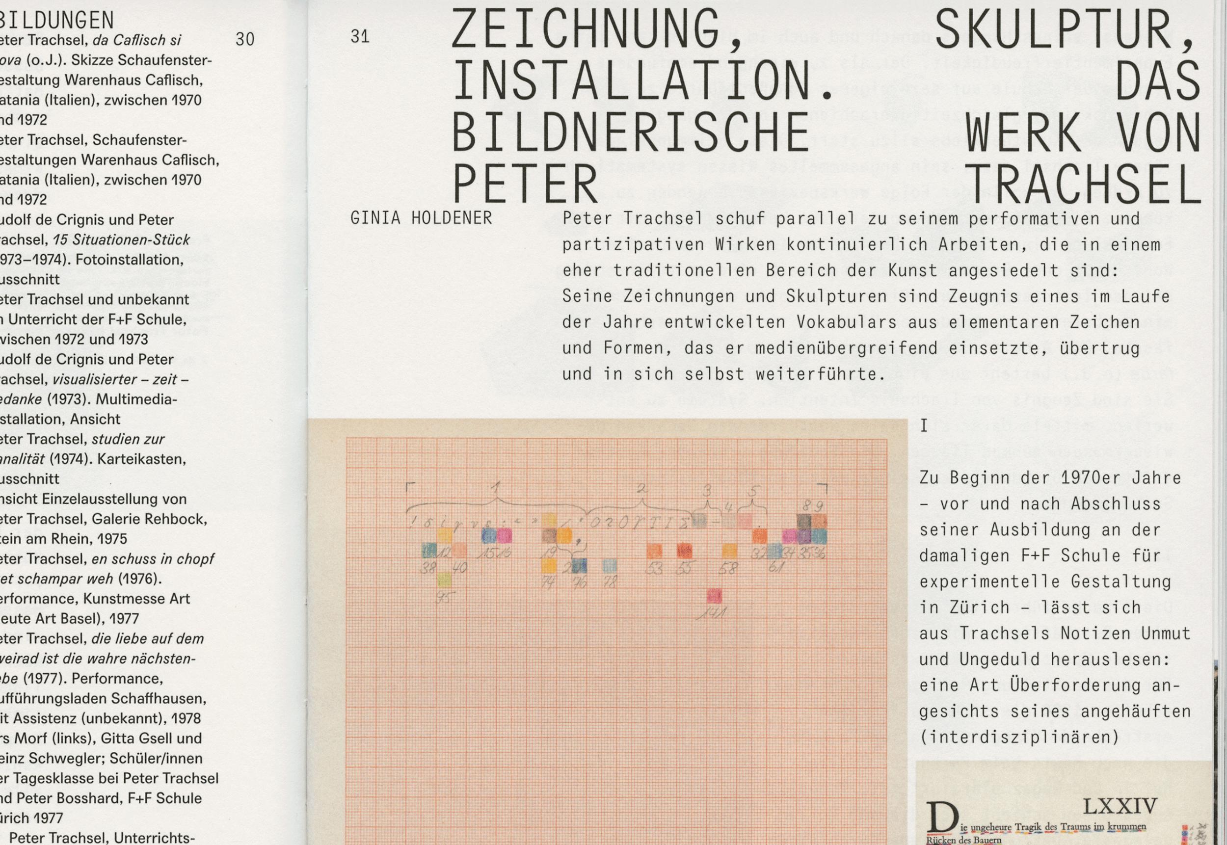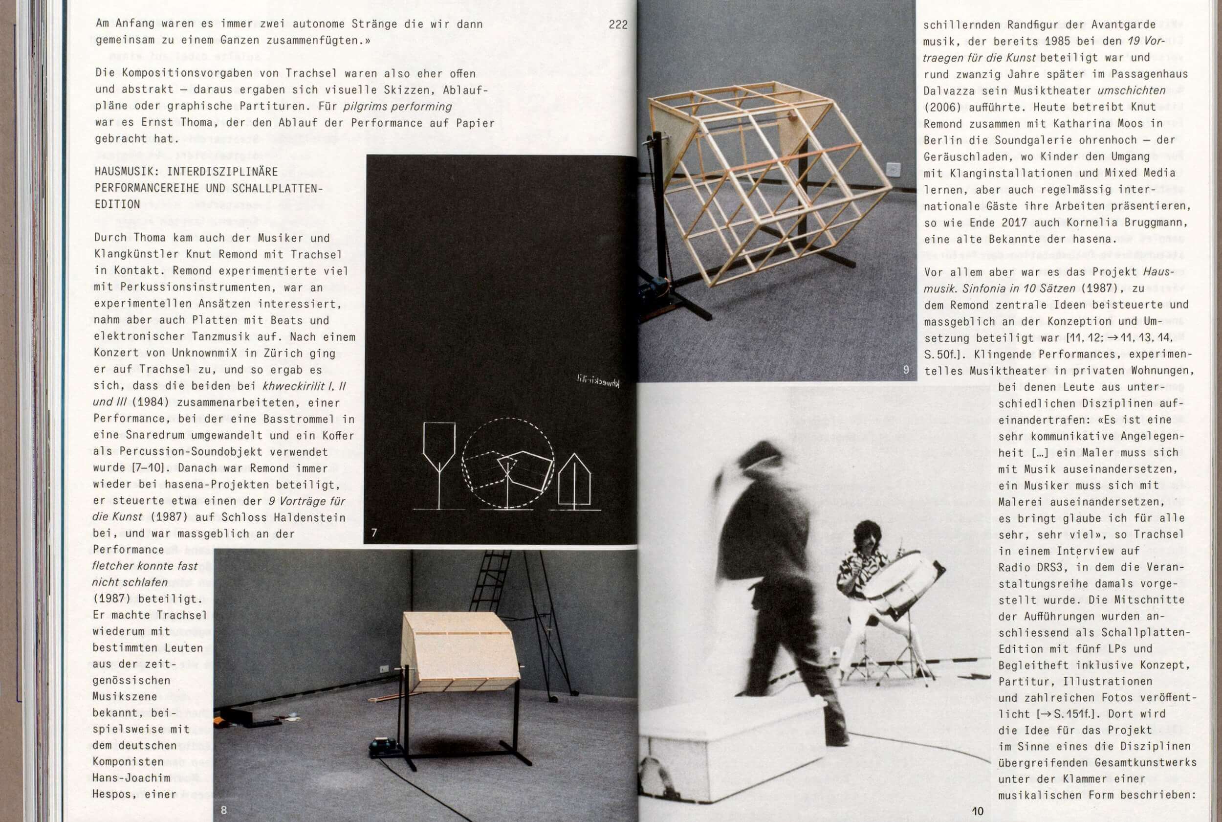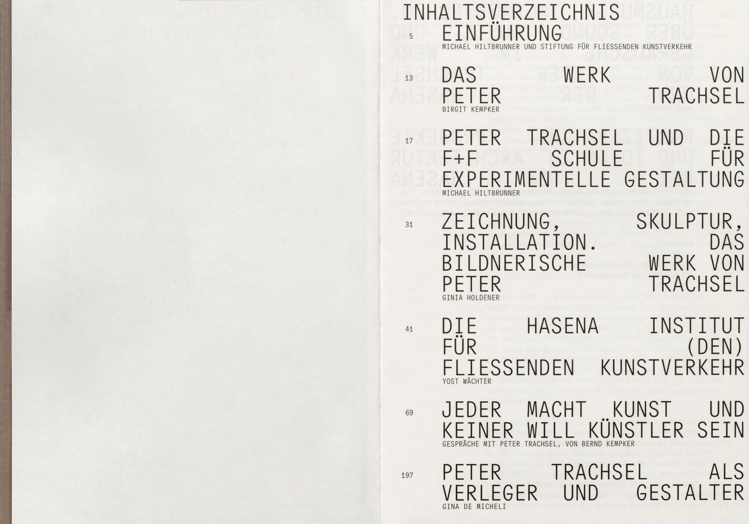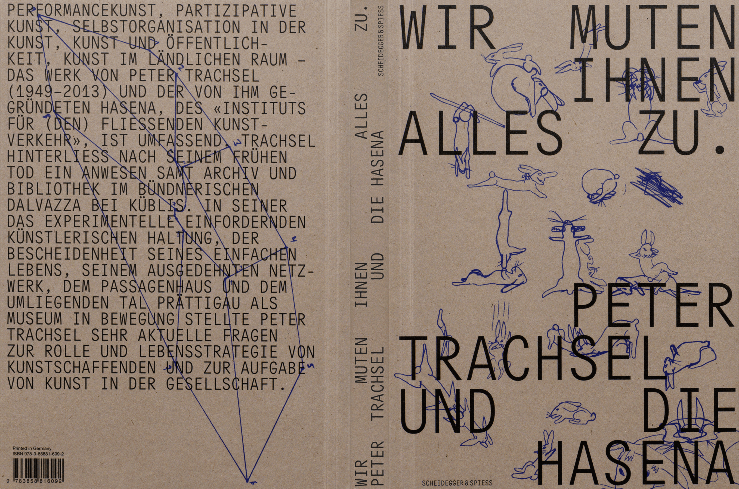 Catalogue about the multidisciplinary, collaborative practice of art activist Peter Trachsel (1949–2013) and the association die Hasena – Institut für (den) fliessenden Kunstverkehr. The core of the book consists of extensive visual documentation of Trachsel’s work created in collaboration with photographer Linus Bill, shot on different locations in and around Küblis, where most of the artist’s activities took place.