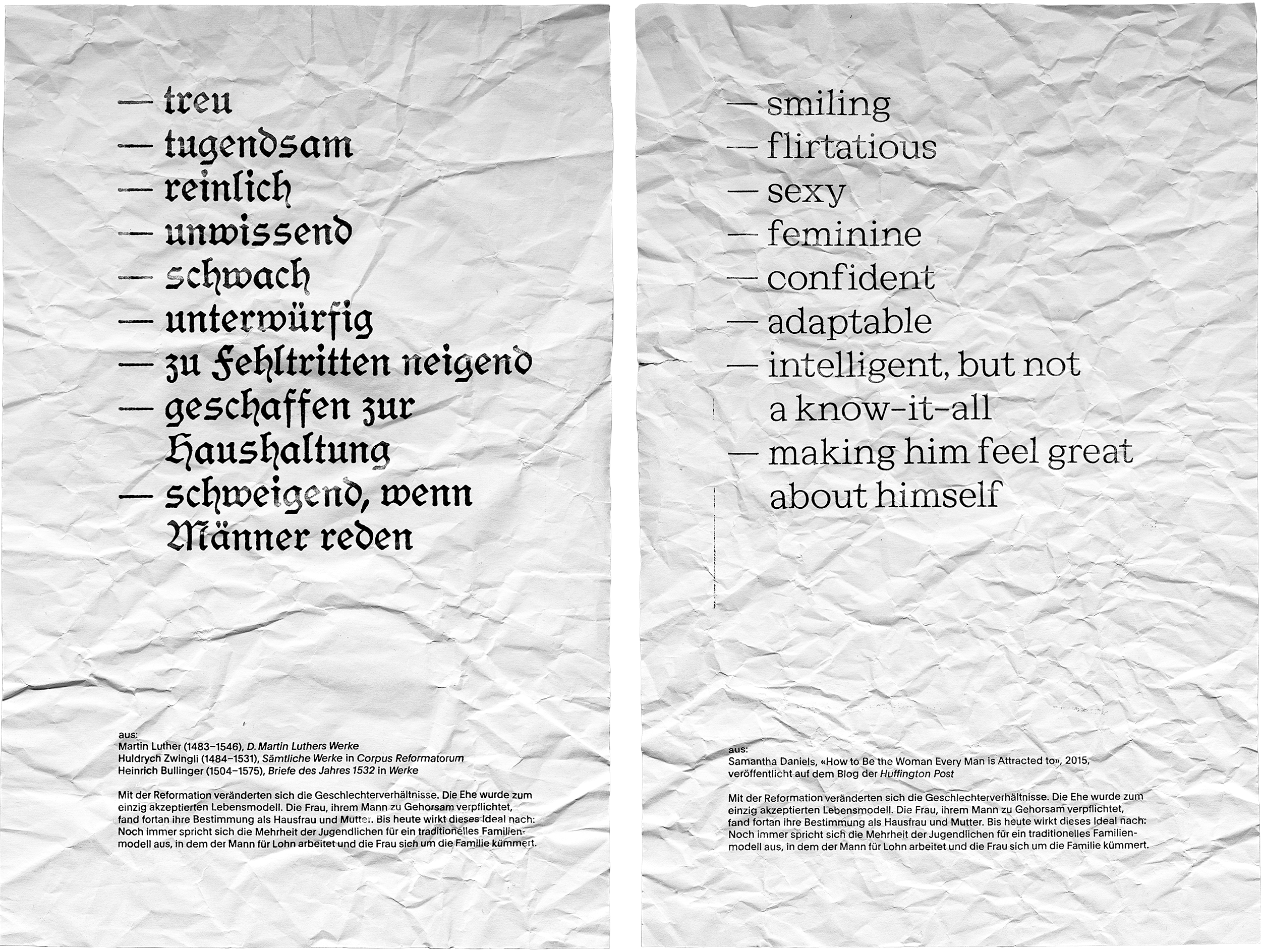 Contribution to the Zurich reformation festival, in the form of two wrapping paper designs for bread baked in front of Helmhaus Zürich. For this commission we addressed the drastic consequences that the Reformation had on women’s rights. Whereas late medieval urban society provided alternatives to life as a housewife, the Reformation forced women back into the private sphere, denying them access to education and basic rights.