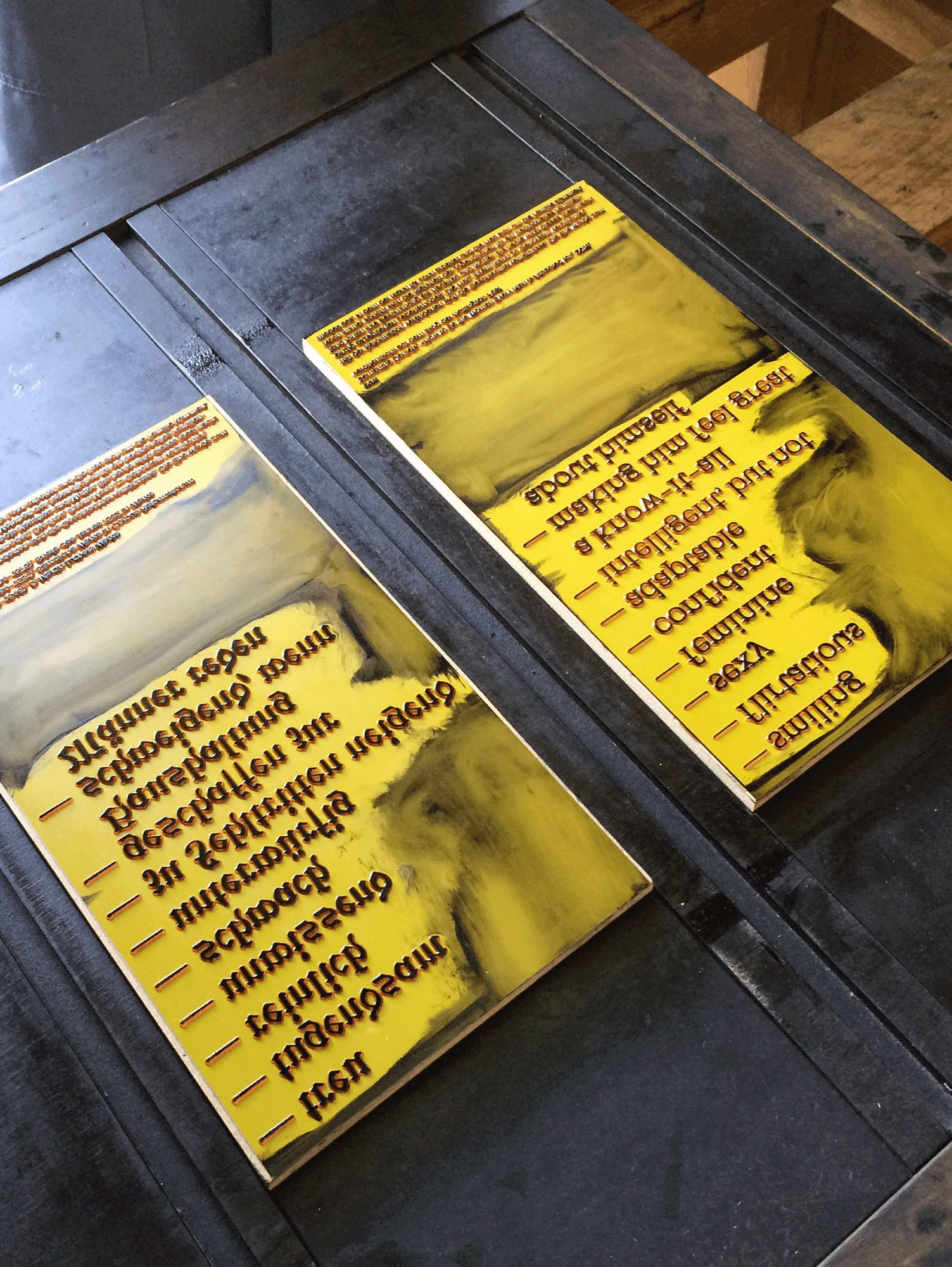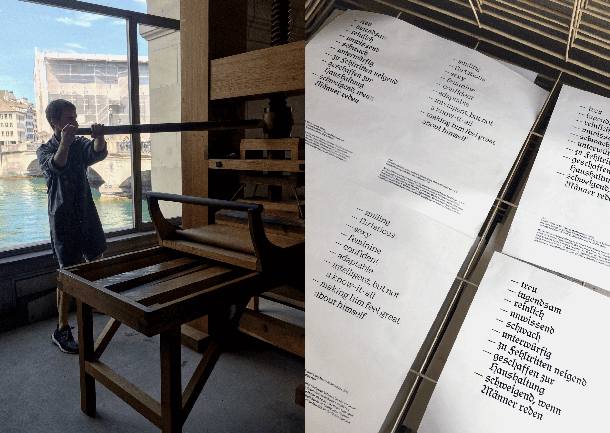 Produced in collaboration with historian Miriam Janett. Printed on location using a replica Gutenberg printing press. Commissioned by Ortreport.