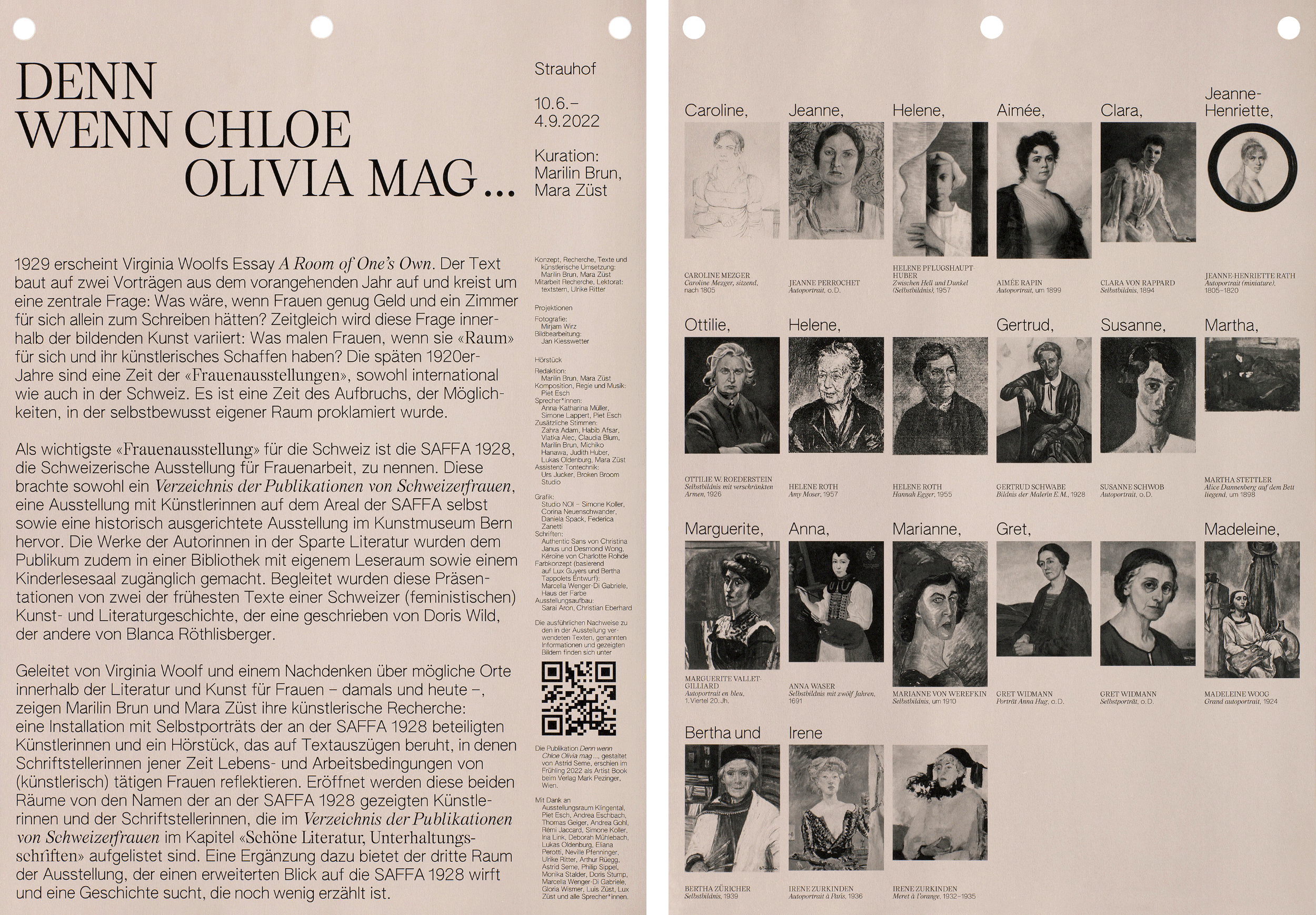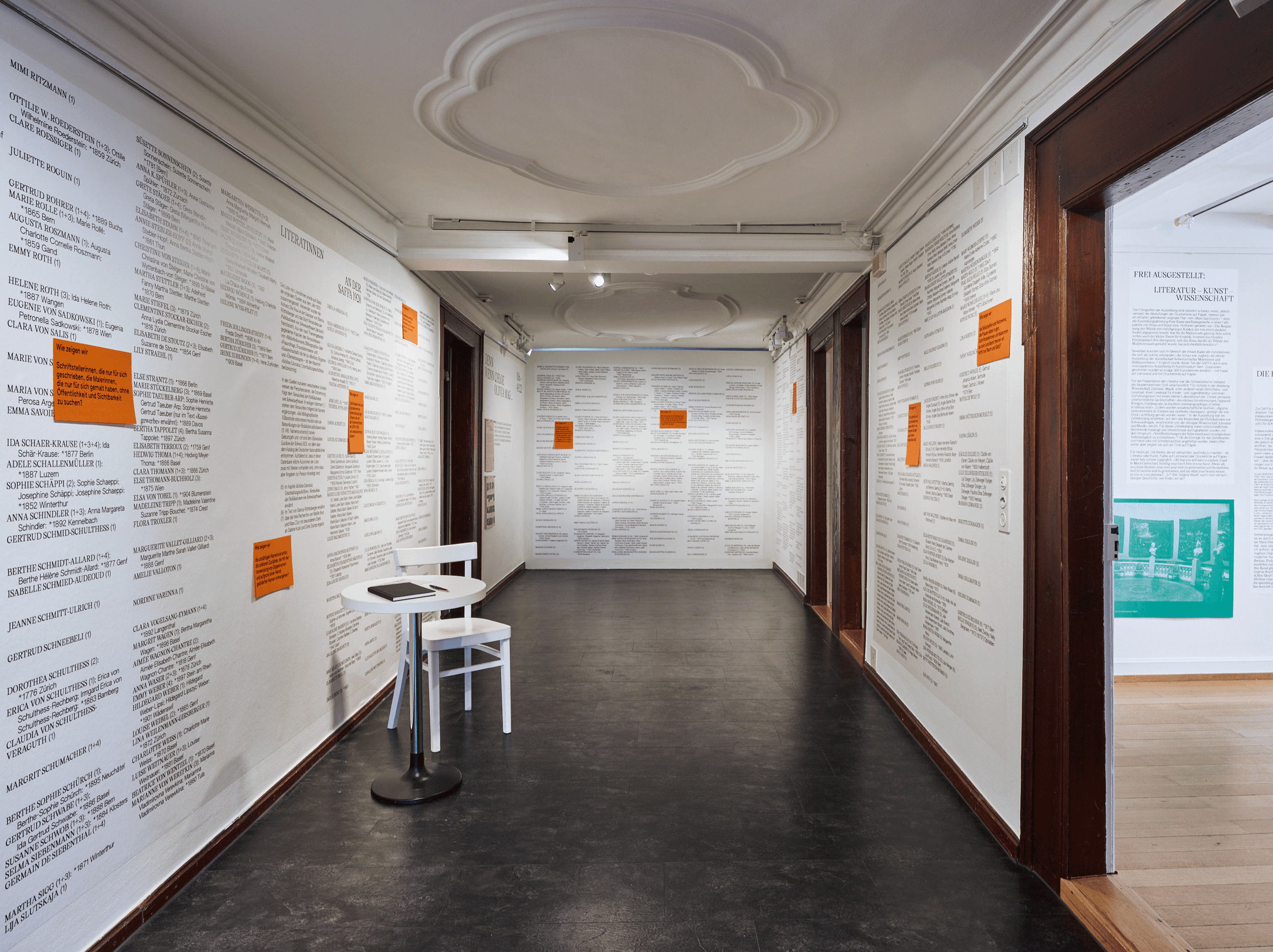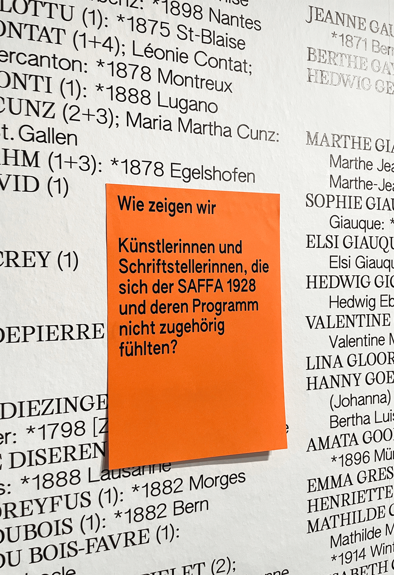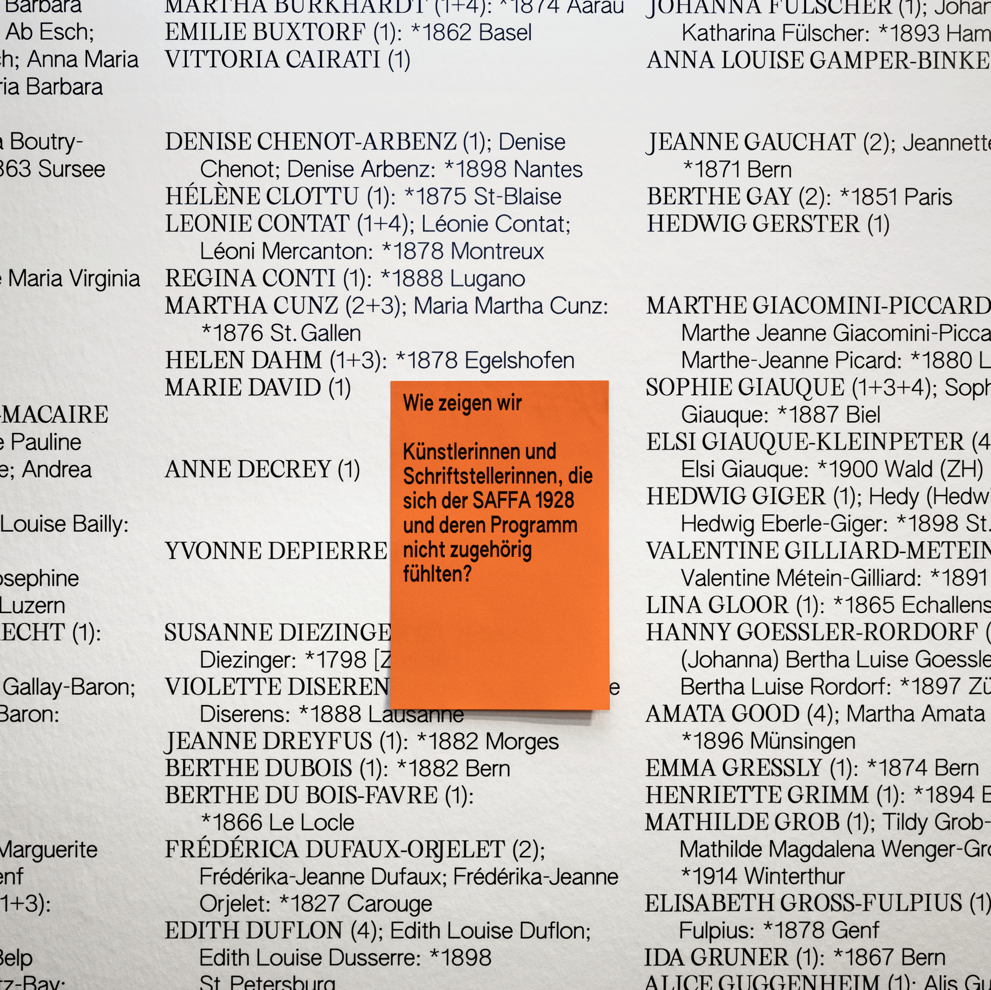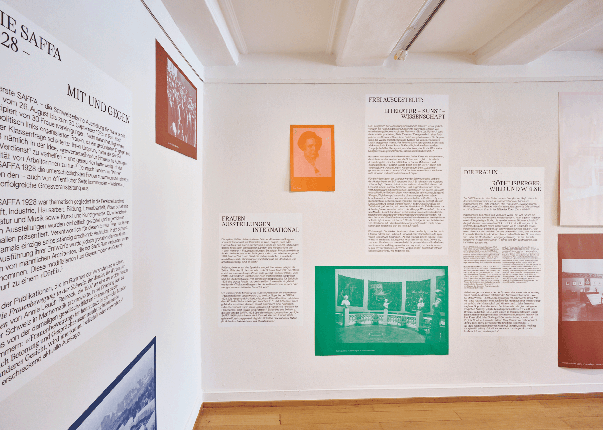 Scenography and graphics for an exhibition about SAFFA 1928 at Museum Strauhof. Starting from historic documents on the arts and literature section of this first exhibition for women’s work in Switzerland, the two artists Marilin Brun and Mara Züst were looking for traces of the hundreds of women artists and writers who were involved in the exhibition at that time. What can we find about them today? And what – or who – is missing, and why?