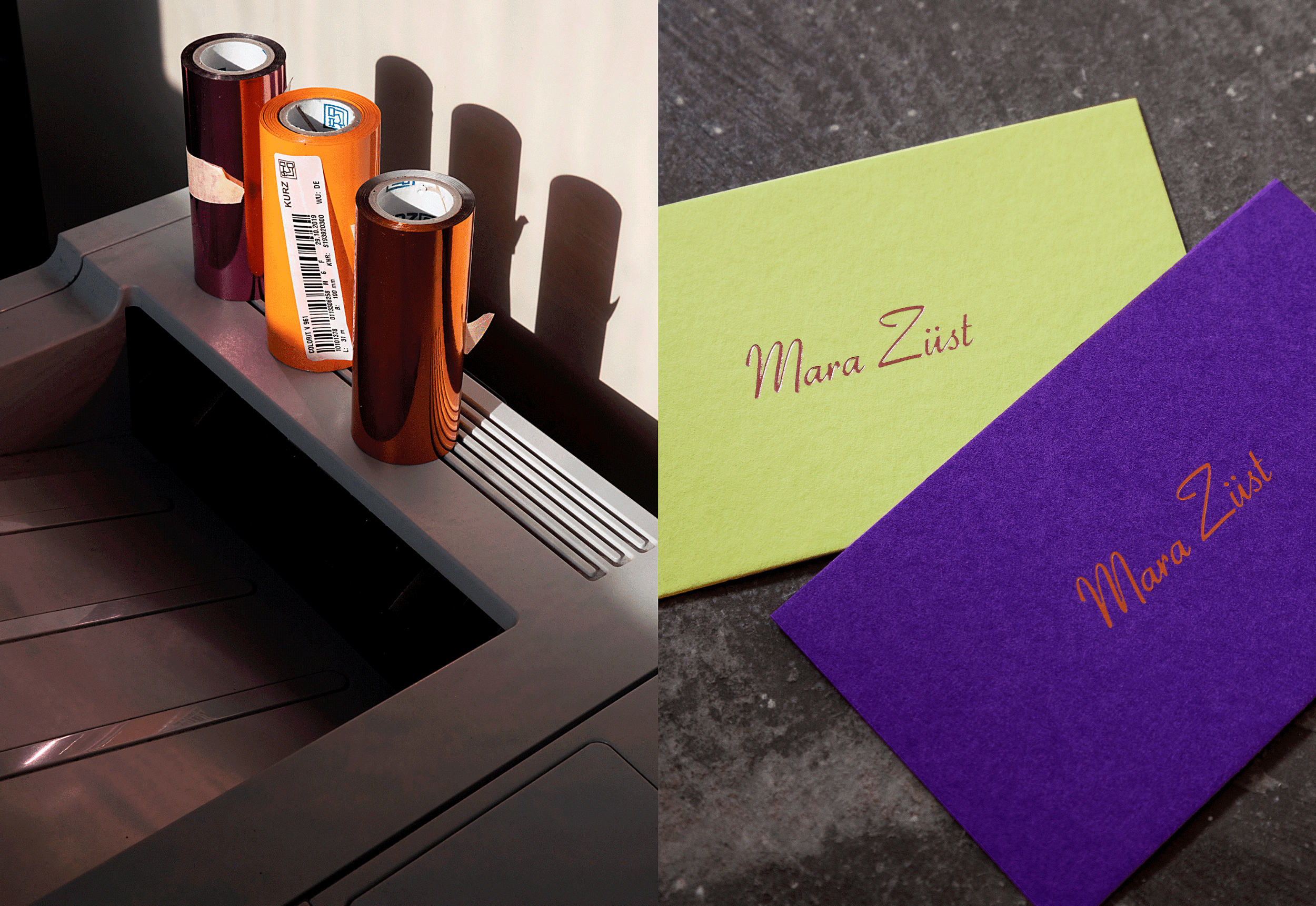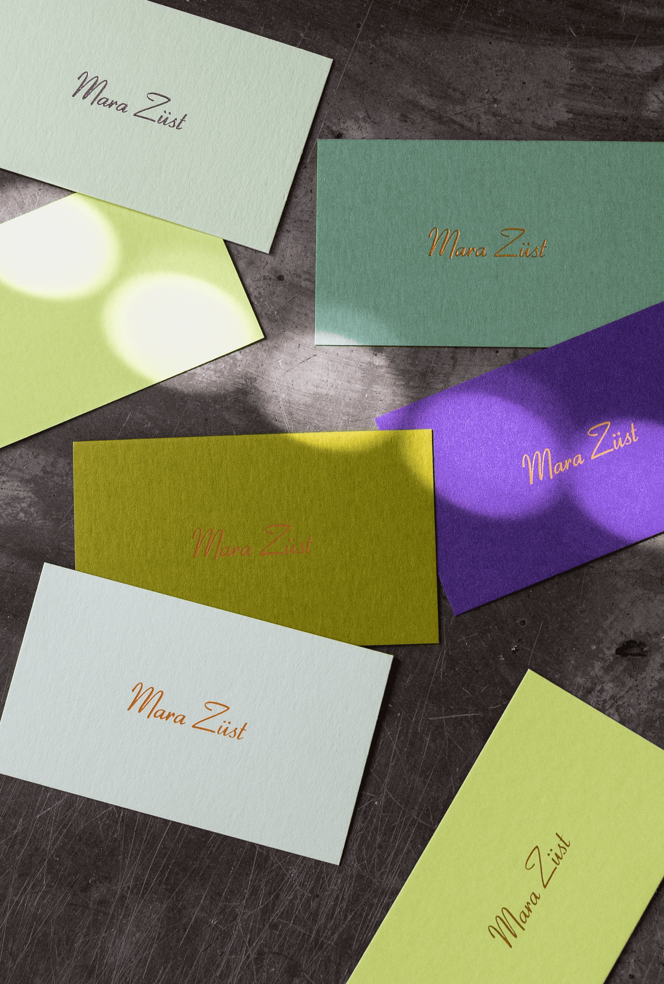 Business card for Mara Züst, whose activities are too wide-ranging to be reduced to one or two job titles. Instead, the card displays only her name, foil blocked on deluxe paper in assorted colours. The normal function of a business card is sidestepped, in favour of a conversation-starter.