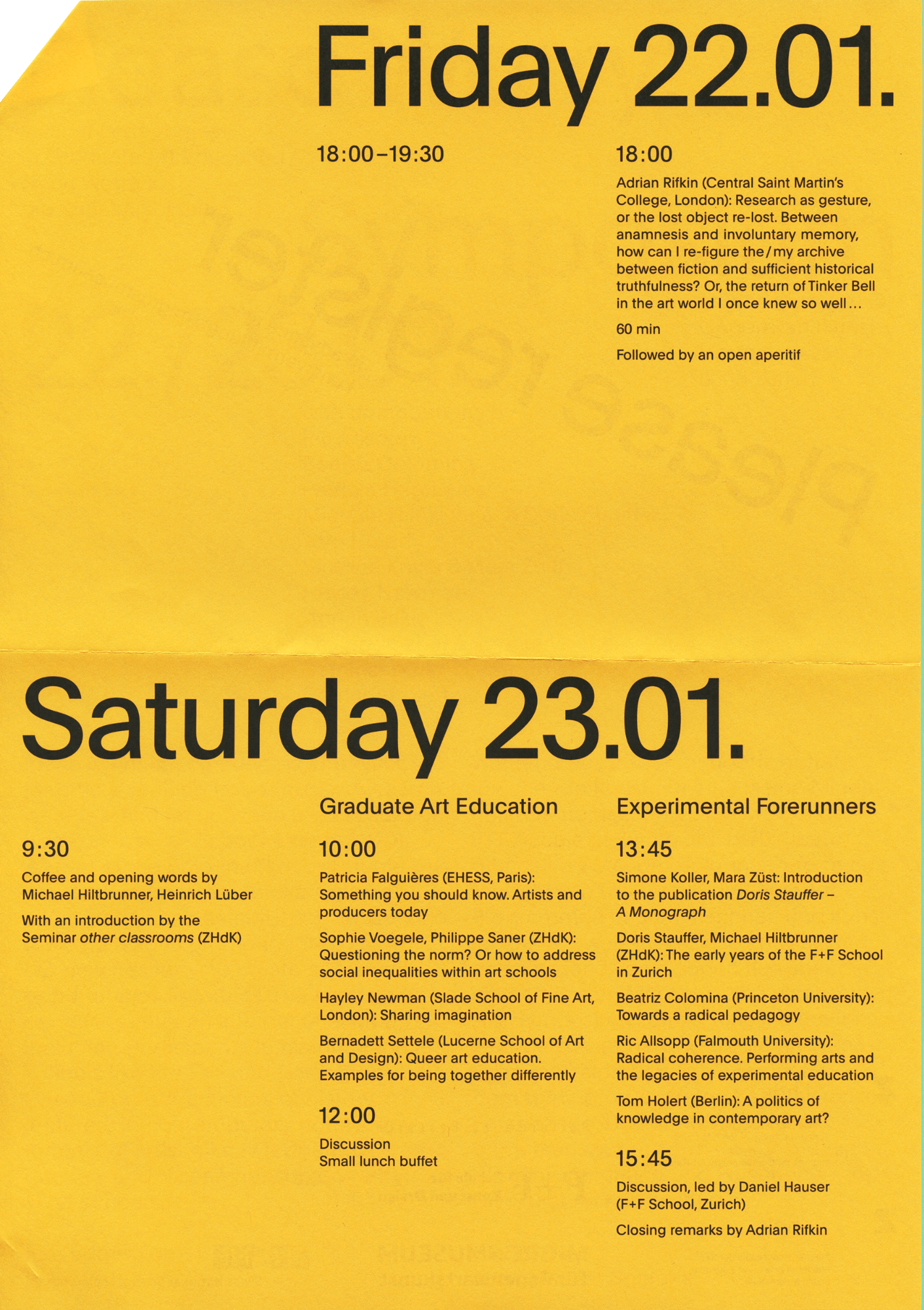 Flyer for a symposium on critical pedagogies in art education, held at Migros Museum für Gegenwartskunst. The title of the event was subverted by printing the programme on cheerfully coloured paper.