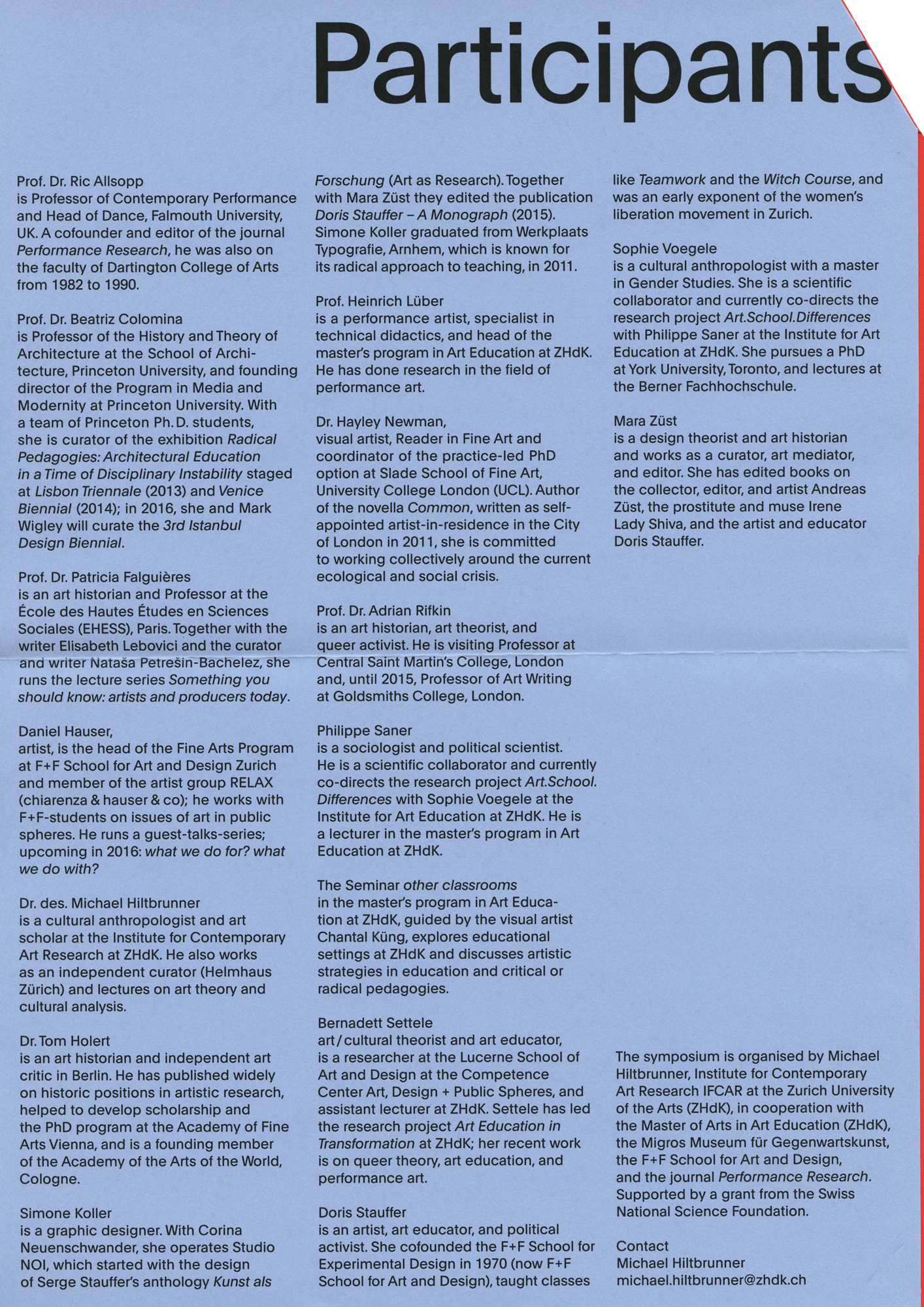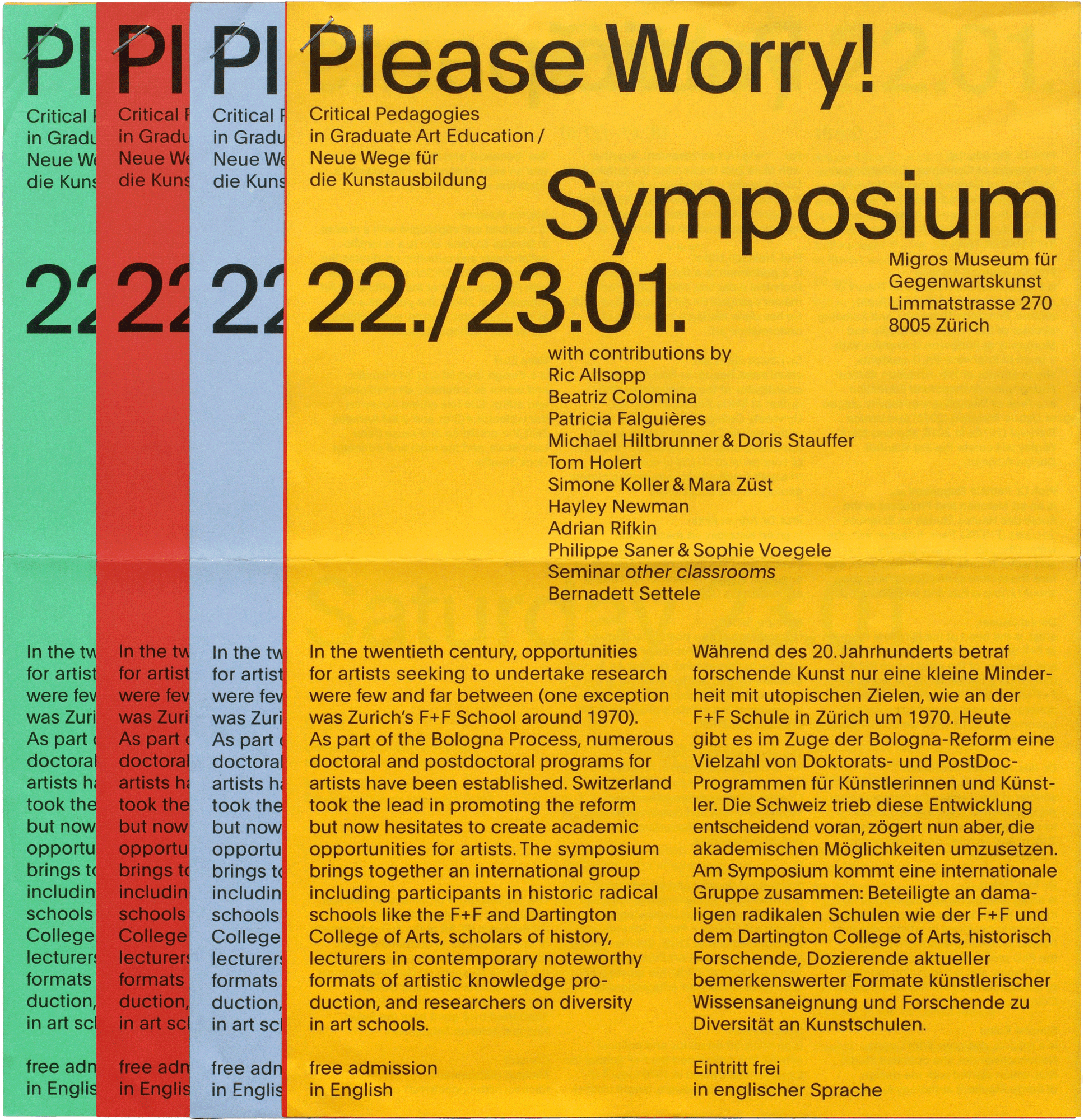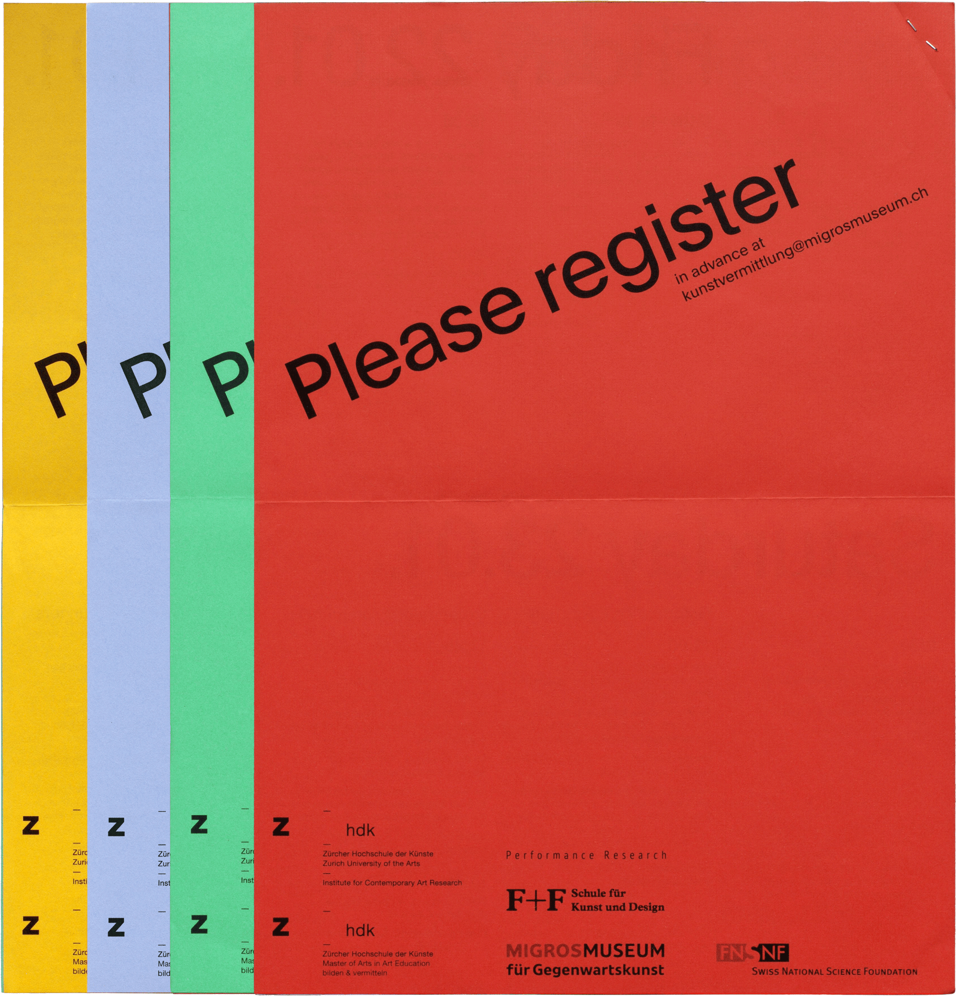 Flyer for a symposium on critical pedagogies in art education, held at Migros Museum für Gegenwartskunst. The title of the event was subverted by printing the programme on cheerfully coloured paper.