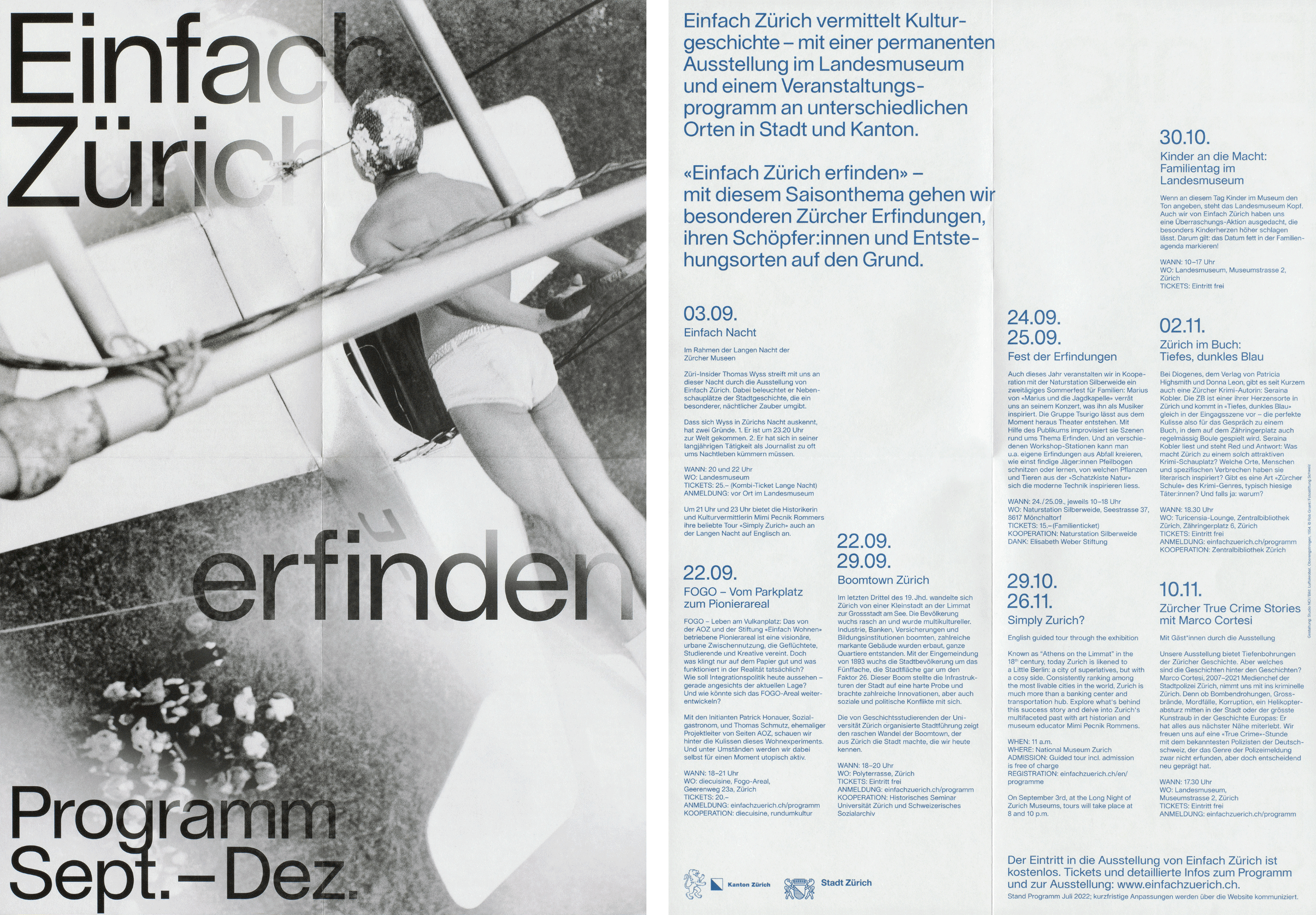 Identity and website for Einfach Zürich, an organisation that explores and communicates Zurich’s cultural history through a permanent exhibition located at the Landesmuseum and regular events held in the Zurich region.