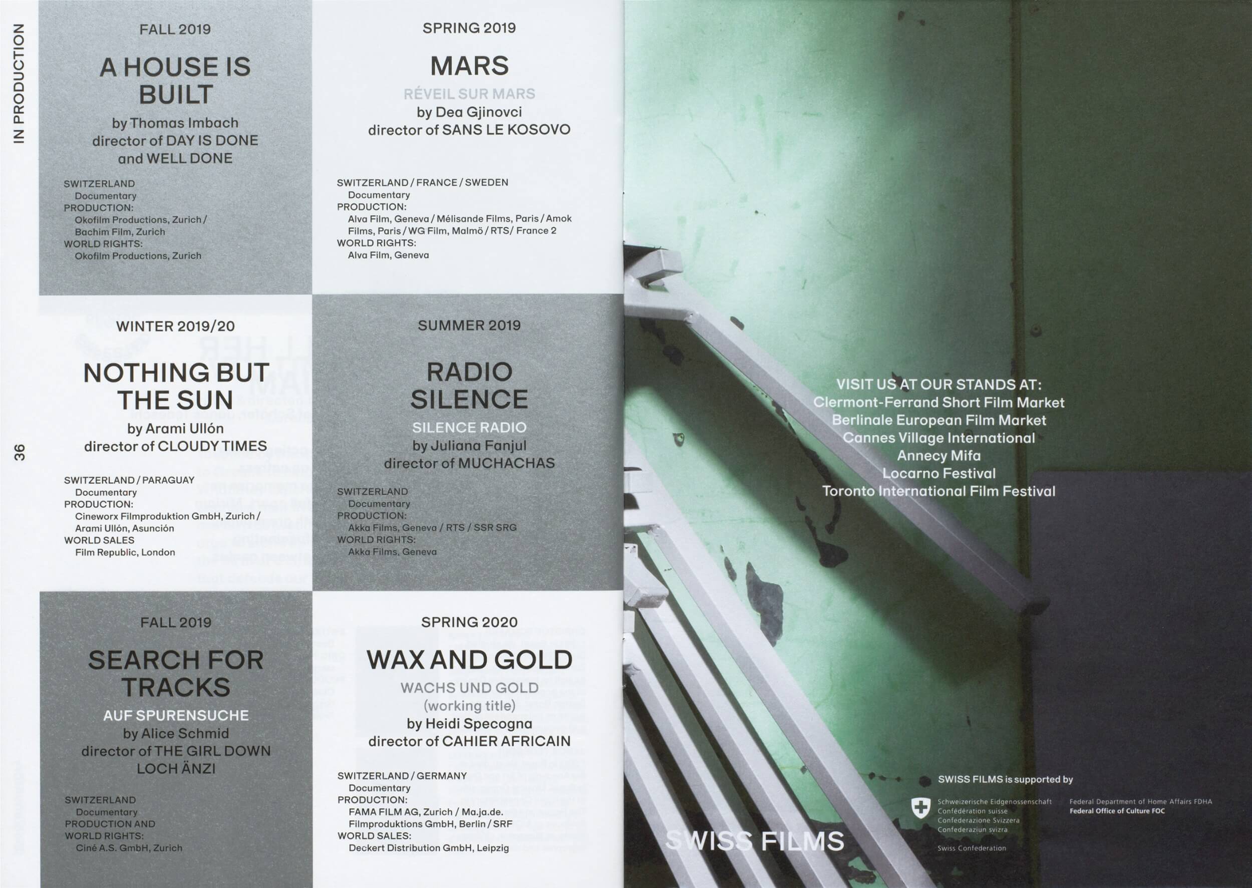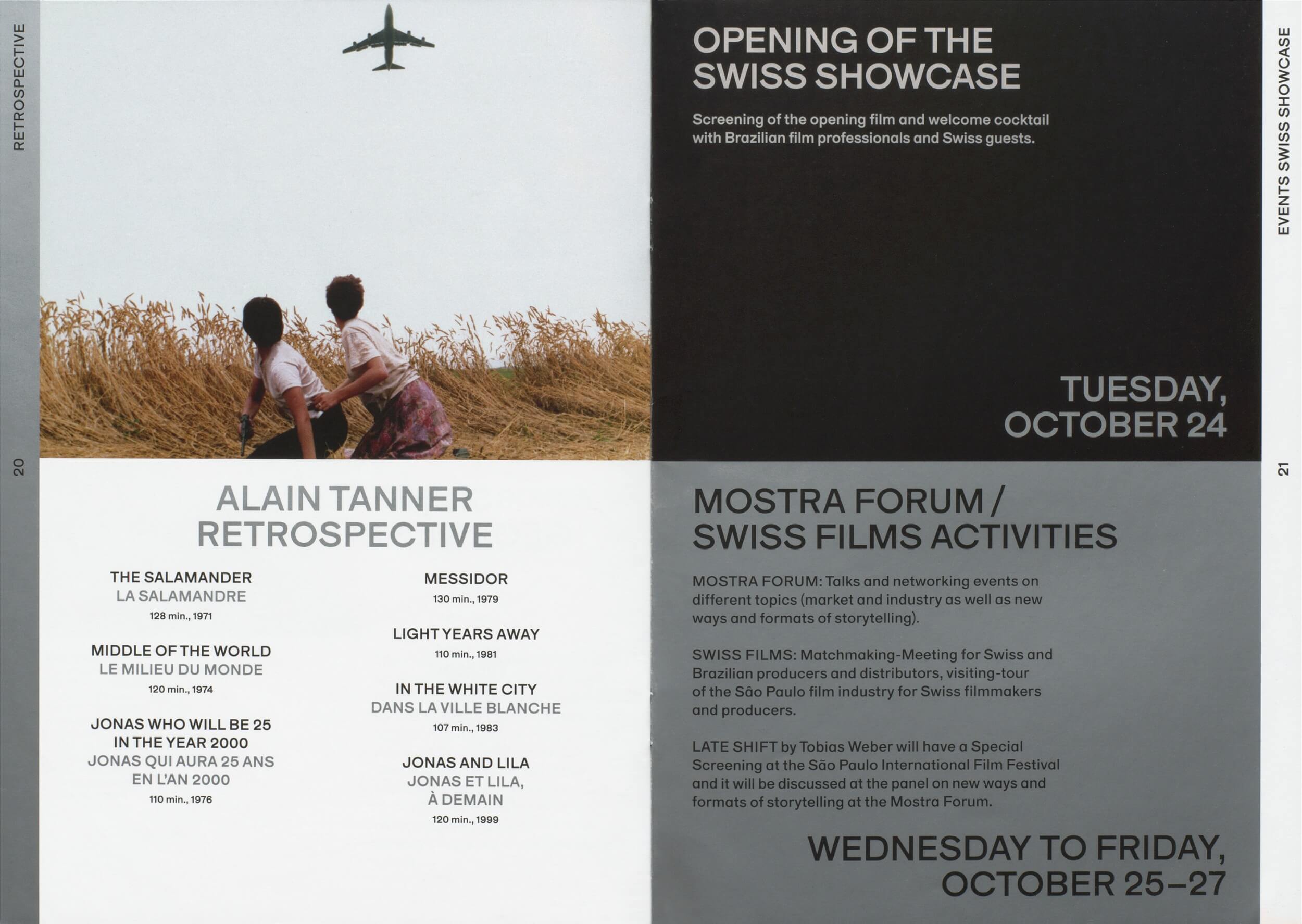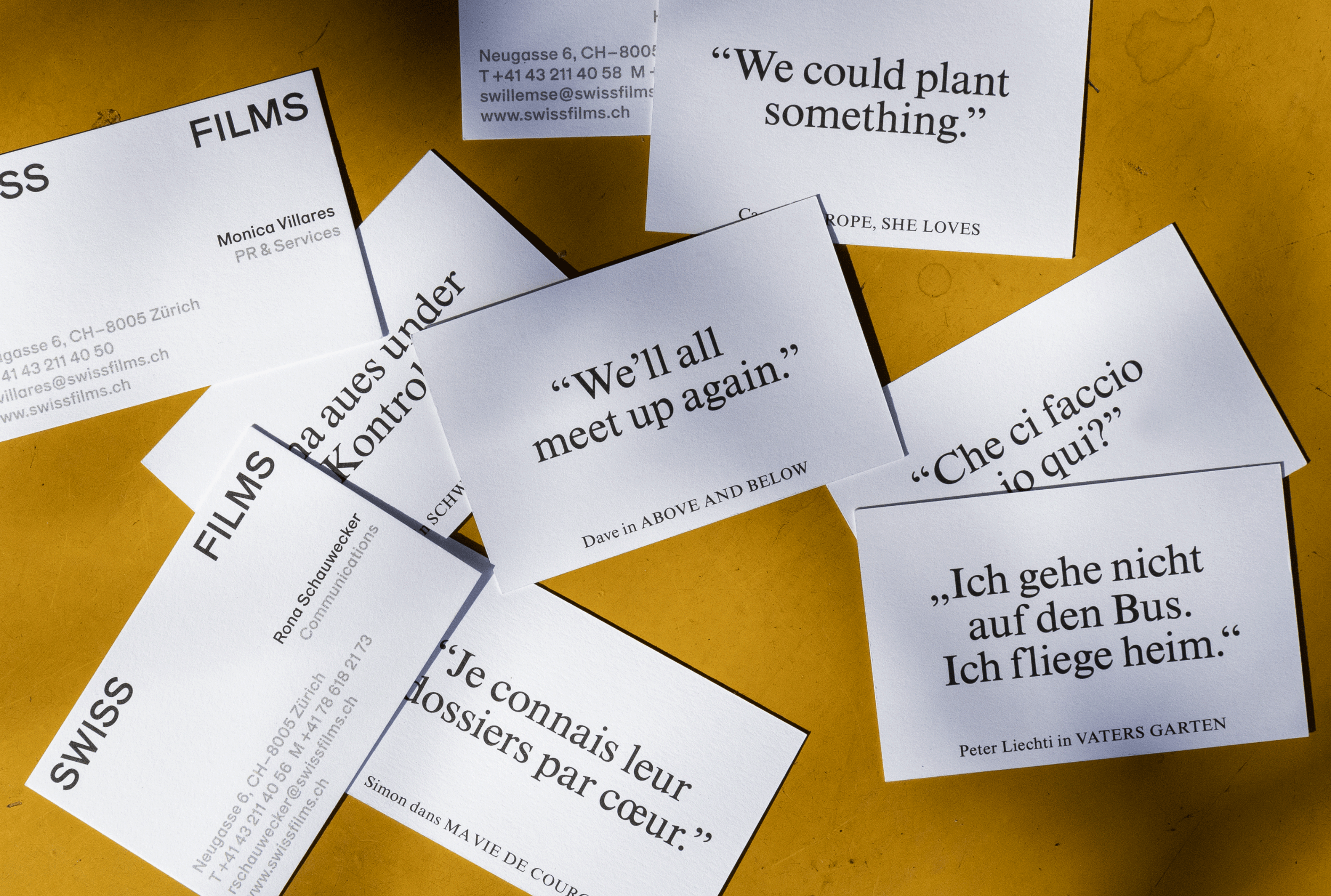 Identity for SWISS FILMS, the national agency which supports and promotes Swiss filmmaking worldwide. Rather than using film stills, selected movie quotes are combined with newly commissioned, contextual visuals to capture the atmosphere and traits of film festival host cities.