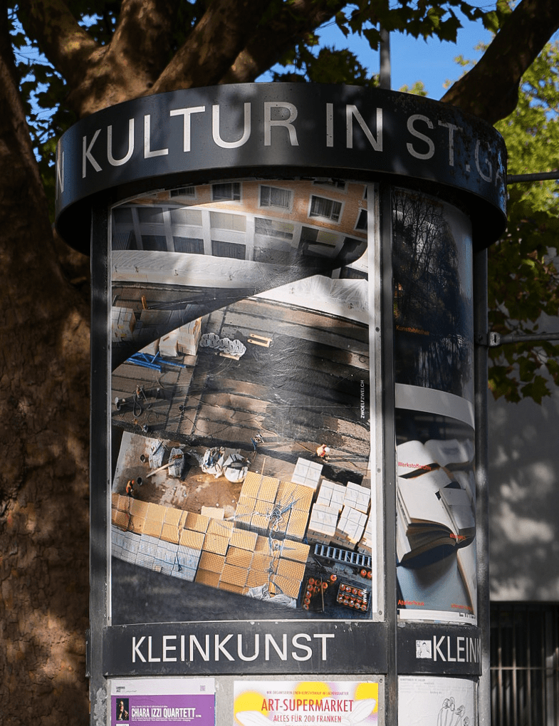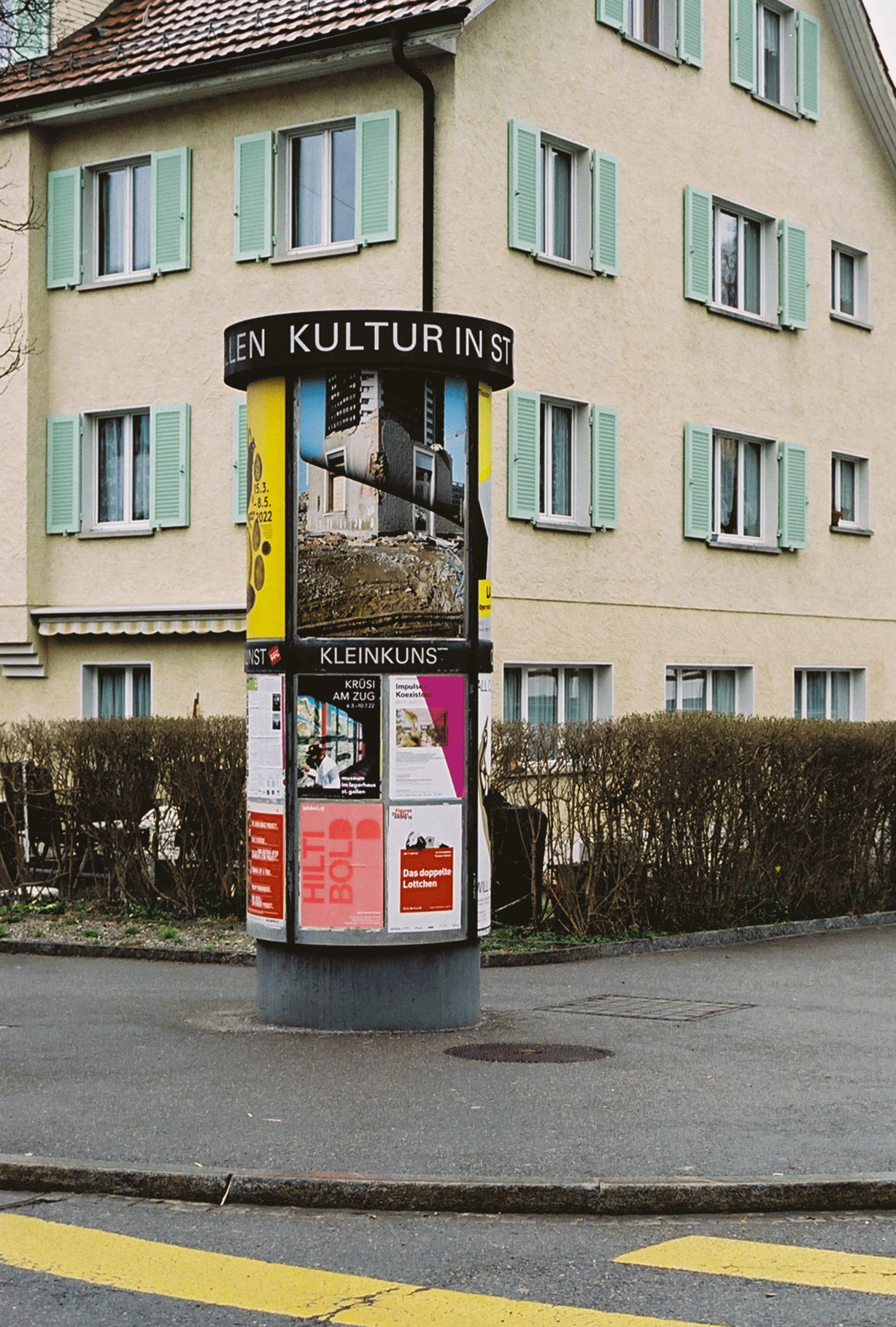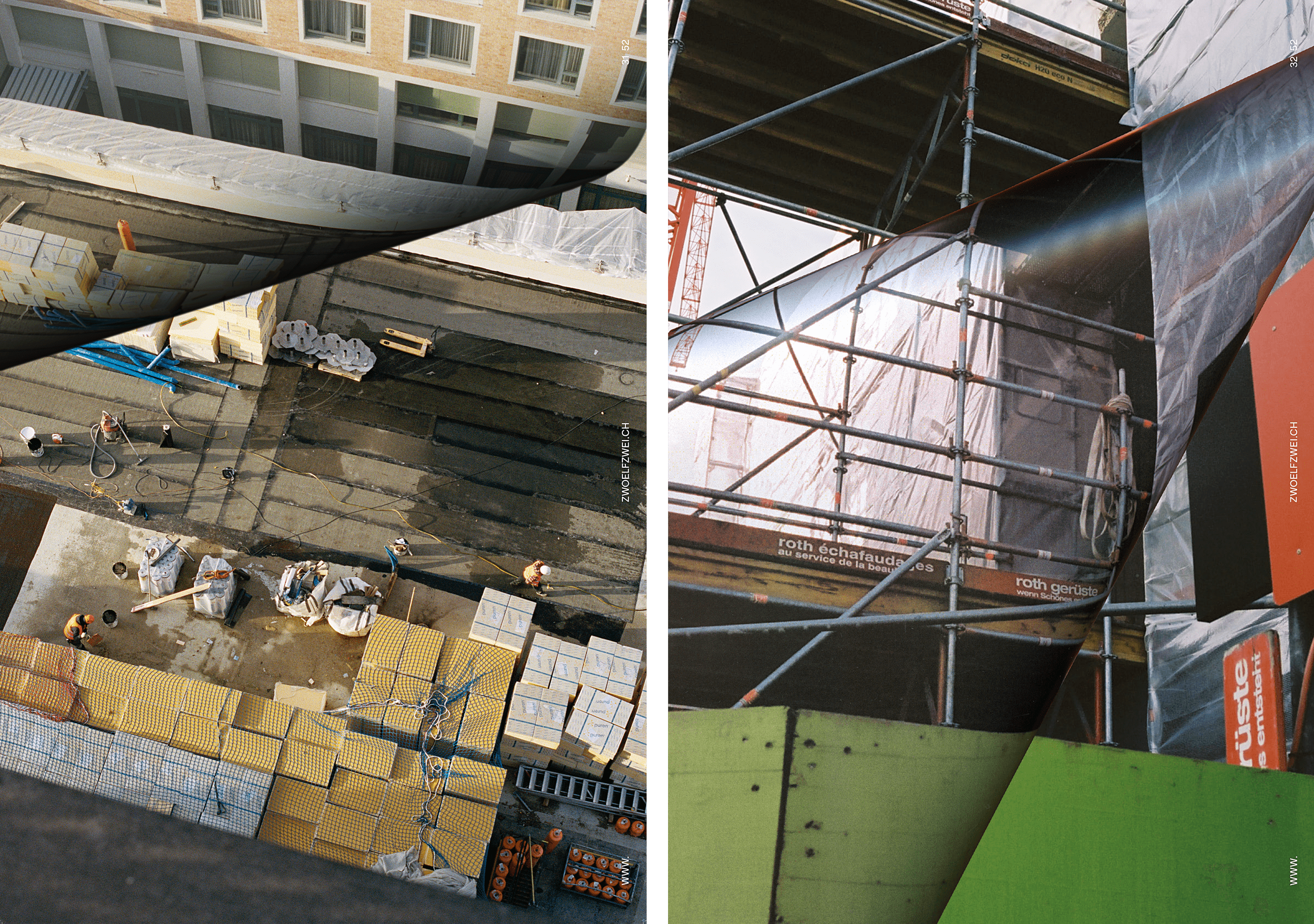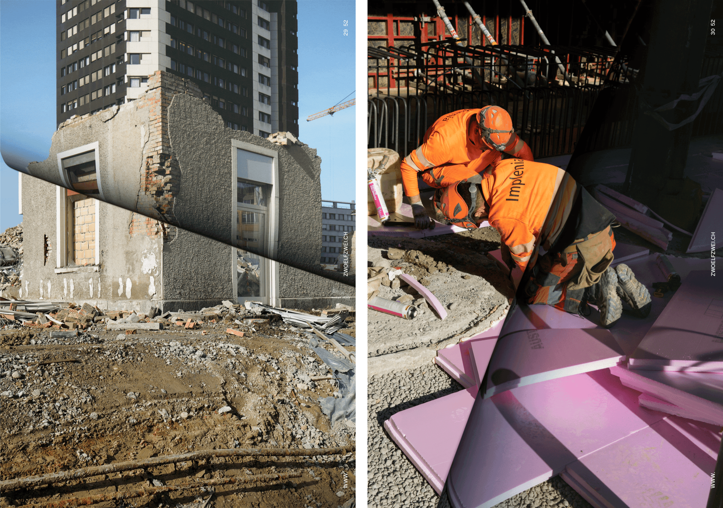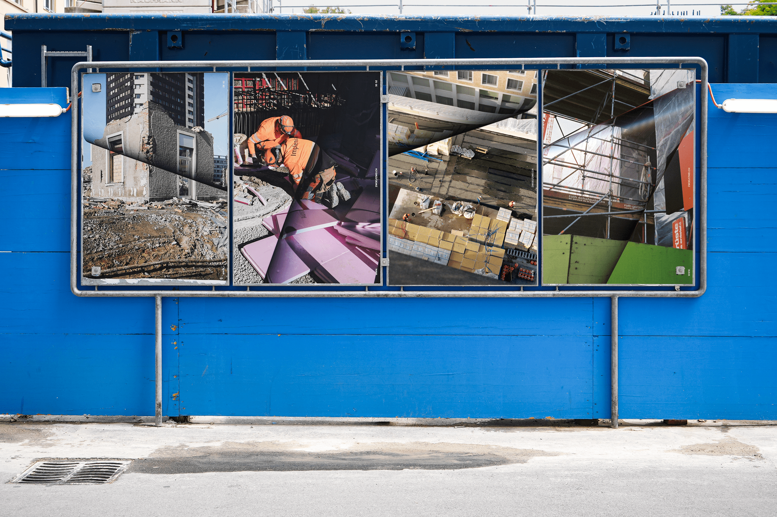 Poster series for a public art project by Katalin Déer. For twelve years, the area of the Cantonal Hospital St. Gallen and the Children’s Hospital of Eastern Switzerland will be a large construction site while still remaining open. The artist Katalin Déer is documenting the building process and each year invites a different studio to make an intervention with her photographs and design four posters, which are mounted every four months on various custom-made poster stands around the building site and in the city of St. Gallen.